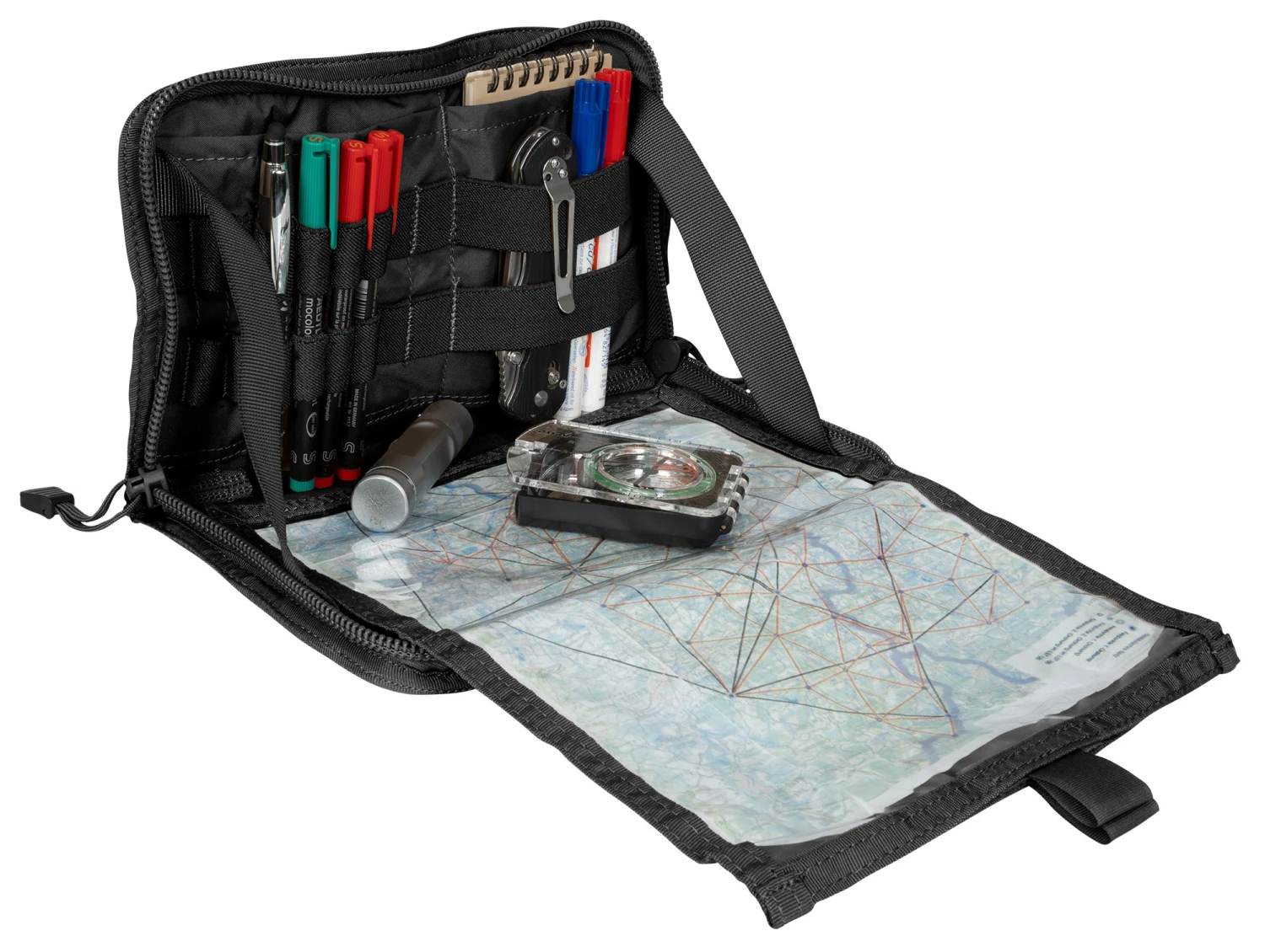 Das Recon Admin Panel ist eine aufklappbare Kartentasche, die eine schnelle Übersicht ermöglicht. Die Ausrüstungstasche ist mit einem Molle Befestigungssystem ausgerüstet, d. h. die Tasche kann flexibel an Plattenträgern und Chest Rigs aufgeschlauft werden.