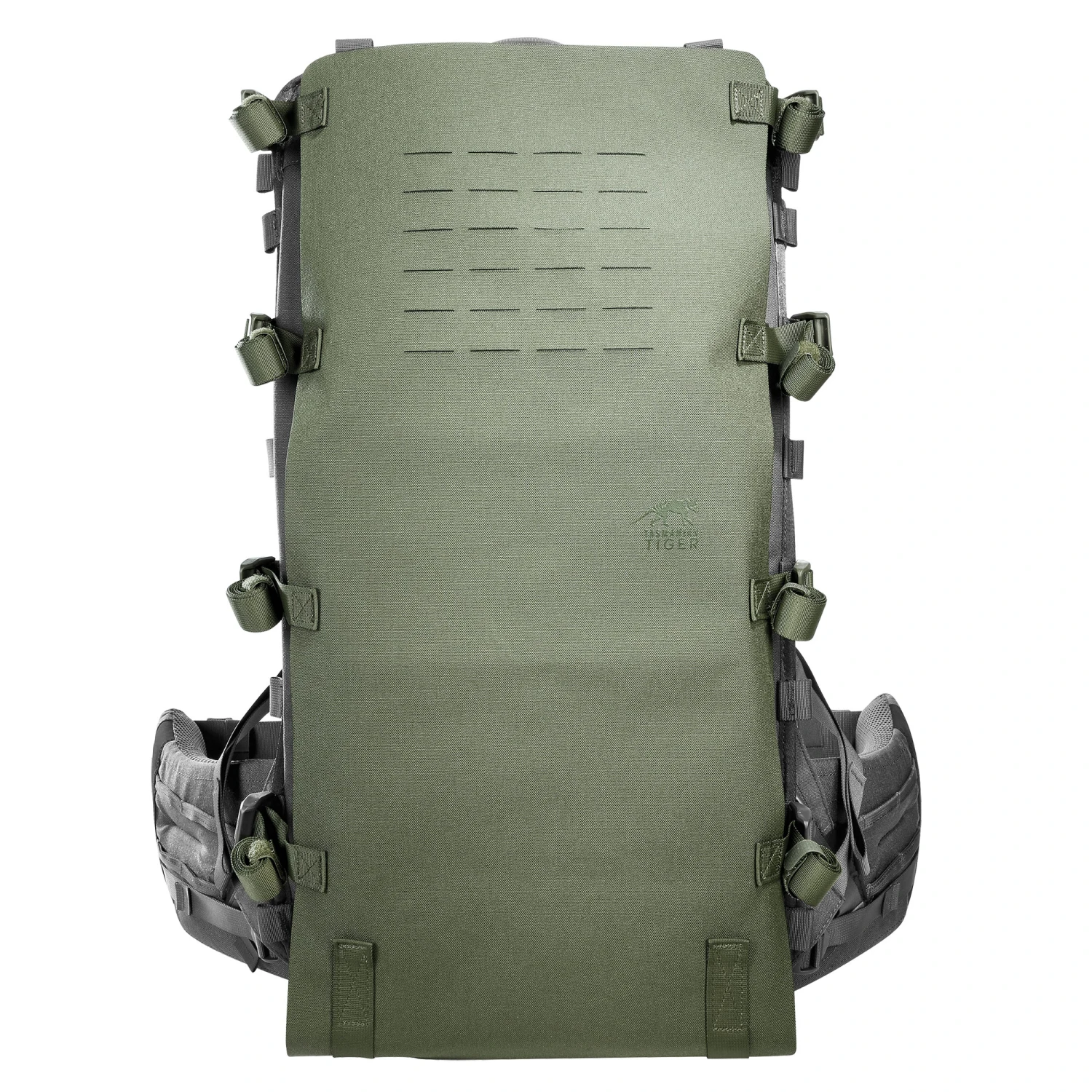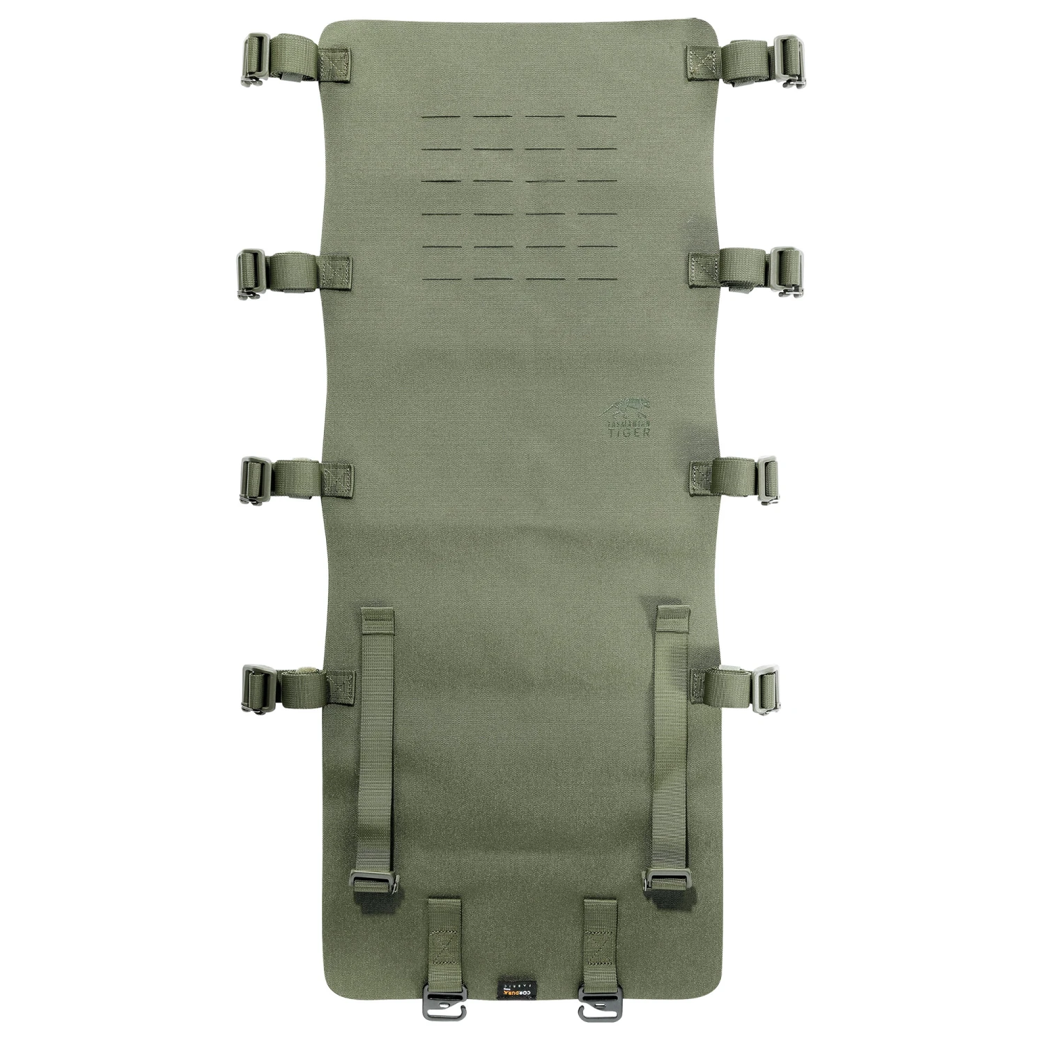 Der Base Carrier Flap wird mit Schnallen und Haken an den Tasmanian Tiger Base Carrier befestigt, und ist selbst auch mit Lasercut Molle -Schlitzen ausgestattet. Das Base Carrier Flap ist eine modulare Transport-Hilfe.