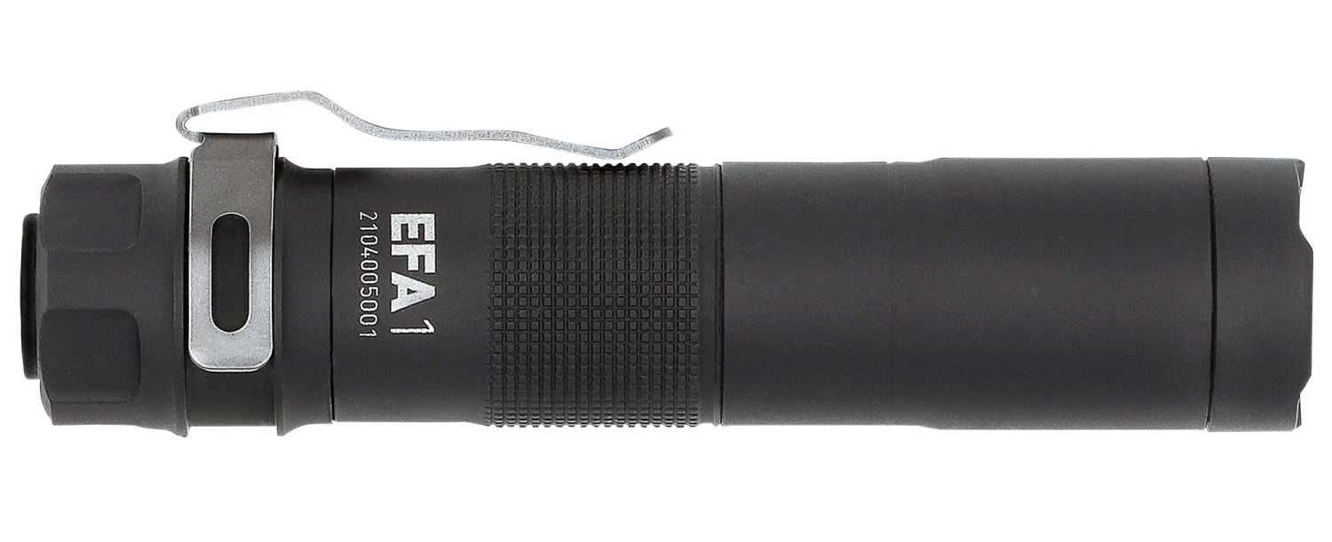 Die EFA1 Taschenlampe ist bestückt mit einer AA-Batterie (1,5 V Mignon) bietet sie 4 Helligkeitsstufen (5/30/60/150 Lumen). Bei Verwendung eines Akkus Typ 14500 steigt die Maximalleistung auf beachtliche 350 Lumen. Ein/Aus und Momentlicht wird per Heckschalter geschaltet, während die Helligkeitsstufen sowie die Sondermodi (Stroboskop und Beacon) über den Seitenschalter aktiviert werden. Der Lichtstärkenspeicher stellt sicher, dass die EFA1 immer auf der Stufe startet, auf der sie zuletzt benutzt wurde. Die Restkapazitätswarnung gibt unter 25 % Restspannung ein Signal. Der abnehmbare Edelstahlclip ermöglicht komfortables Tragen. Das solide Alugehäuse ist hartanodisiert und wasserdicht nach IPX8.